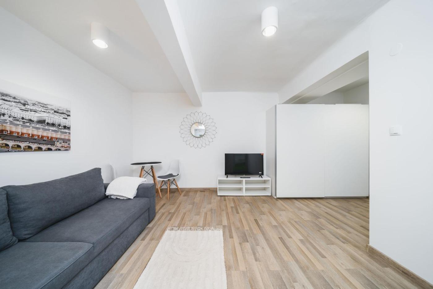 Studio z rozkładaną sofą. The studio offers a washing machine, a private entrance, as well as a private bathroom boasting a shower and a hairdryer. The well-equipped kitchenette has a stovetop, a refrigerator, a dishwasher and kitchenware. The studio features a tea and coffee maker, a wardrobe, a sofa, a flat-screen TV, as well as ancourtyard view. The unit has 1 bed. Studio - 2 osobowy. Powierzchnia pokoju ok.: 35 mkw.