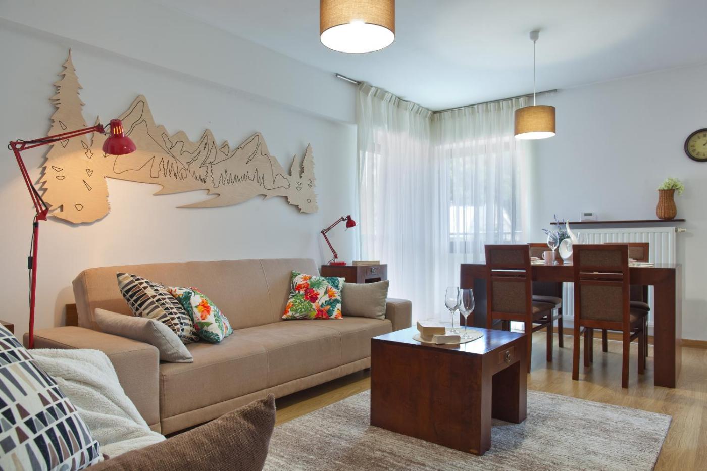 Apartament z 1 sypialnią. This apartment is comprised of 1 living room, 1 separate bedroom and 1 bathroom with a shower and a hairdryer. The kitchenette is fitted with a refrigerator, kitchenware and a microwave. The apartment offers a flat-screen TV, a dining area, a wardrobe, a tiled floor as well as mountain views. The unit offers 3 beds. Apartament - 5 osobowy. Powierzchnia pokoju ok.: 51 mkw.