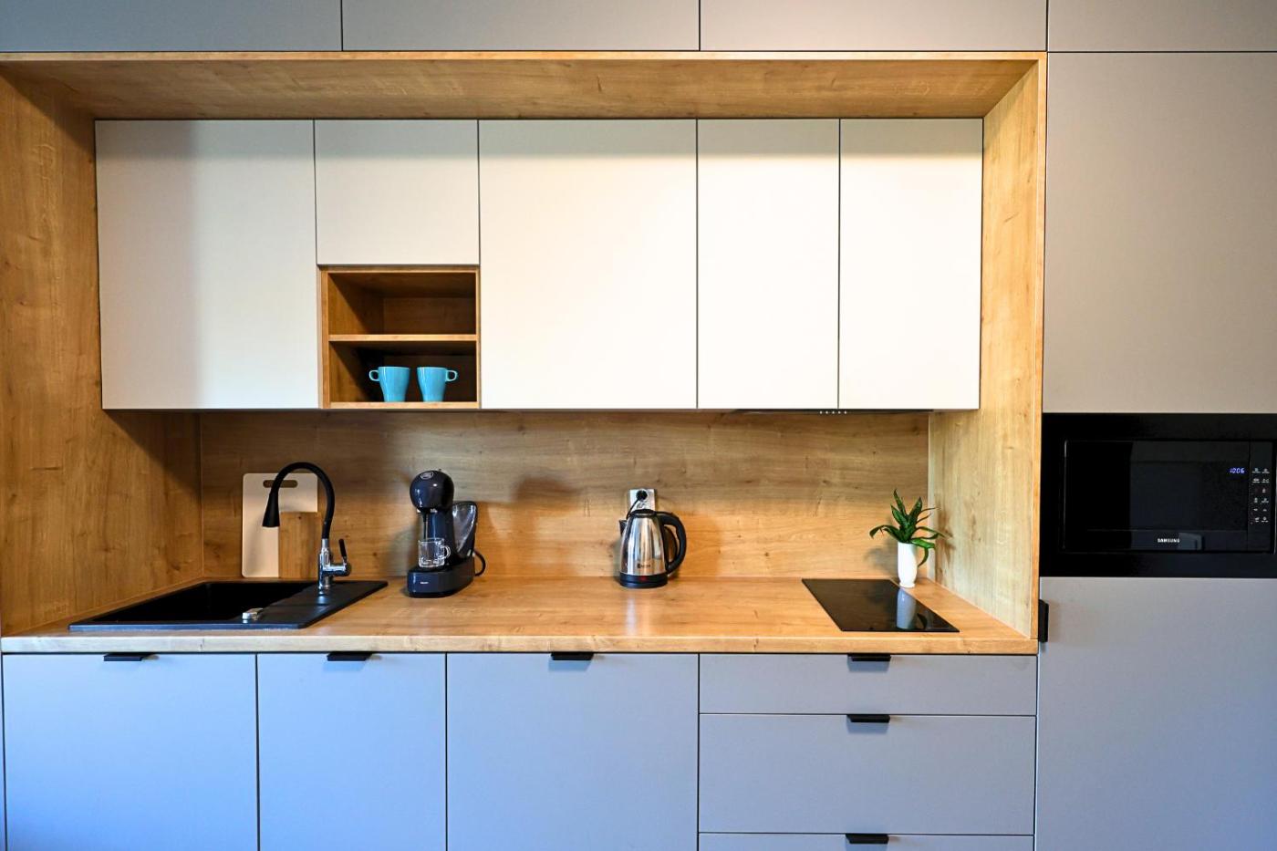 W apartamencie znajduje się telewizor z płaskim ekranem. Wyposażenie aneksu kuchennego obejmuje lodówkę, zmywarkę, mikrofalówkę, a także ekspres do kawy i czajnik.