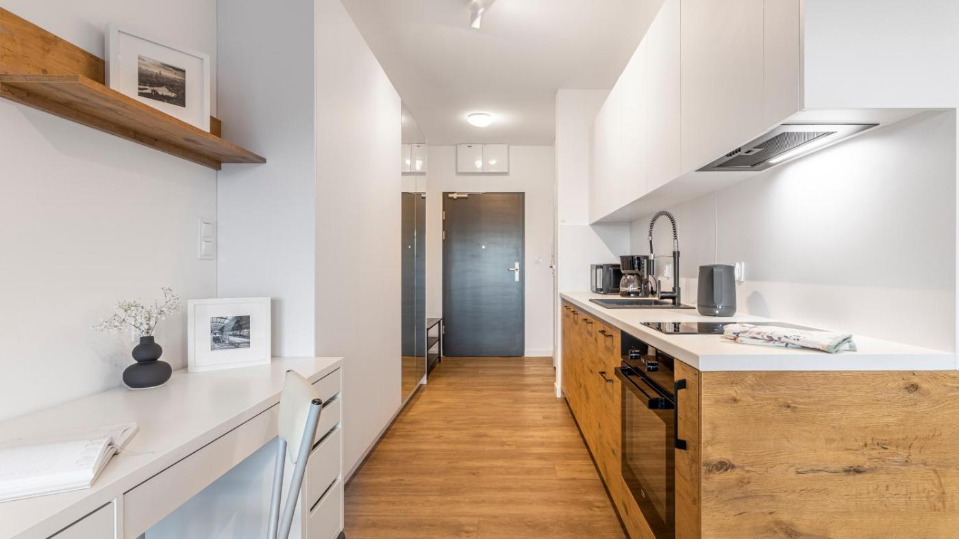 Studio z balkonem. The well-equipped kitchenette features a stovetop, a refrigerator, kitchenware and an oven. The studio offers a coffee machine, a dining area, a balcony with city views as well as a private bathroom featuring a shower. The unit offers 2 beds. Studio - 3 osobowy. Powierzchnia pokoju ok.: 28 mkw.