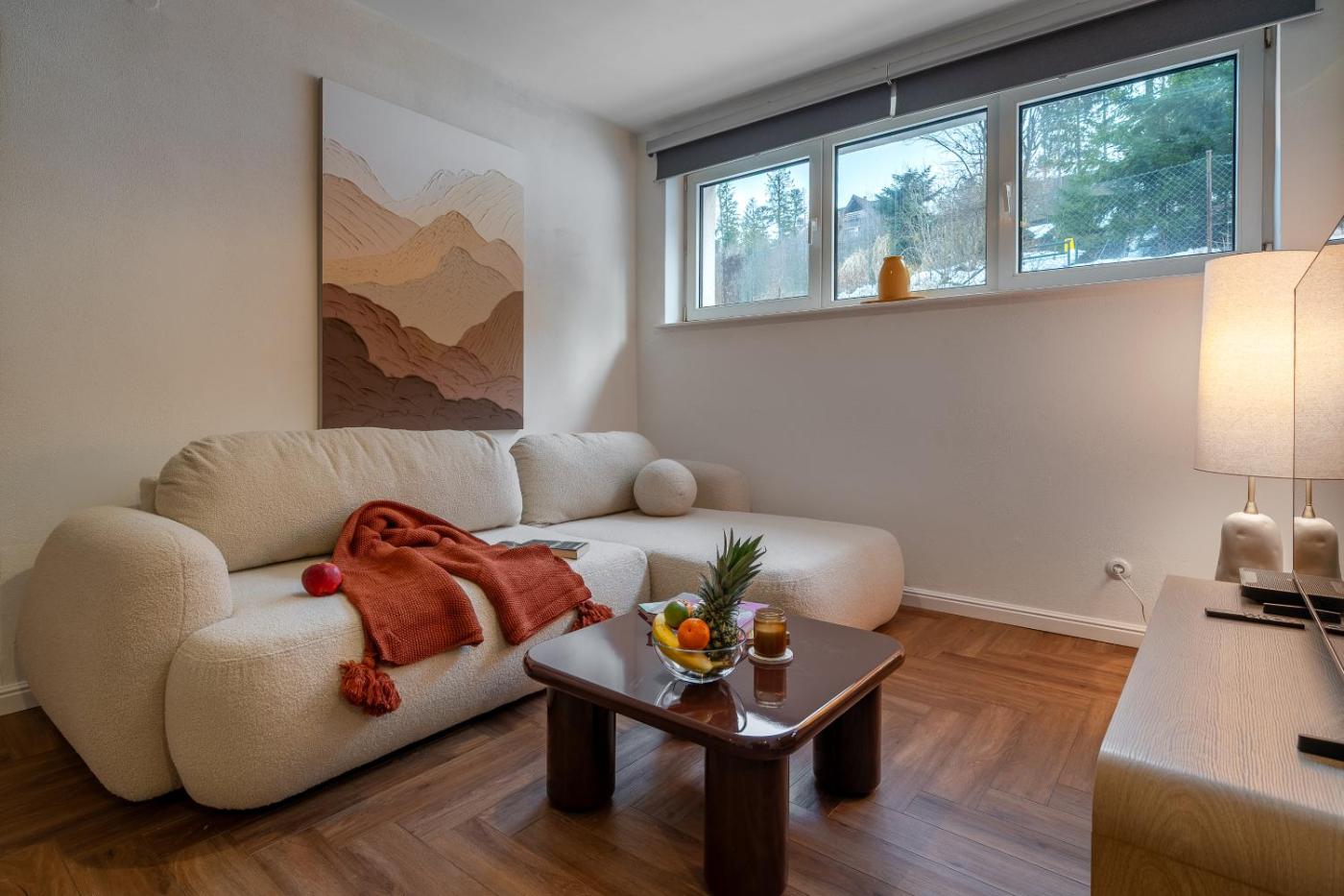 Oferta apartamentu obejmuje sypialnię (1), salon, kuchnię z pełnym wyposażeniem, w tym lodówką i ekspresem do kawy, a także łazienkę (1) z prysznicem oraz suszarką do włosów. W apartamencie zapewniono ręczniki i pościel.